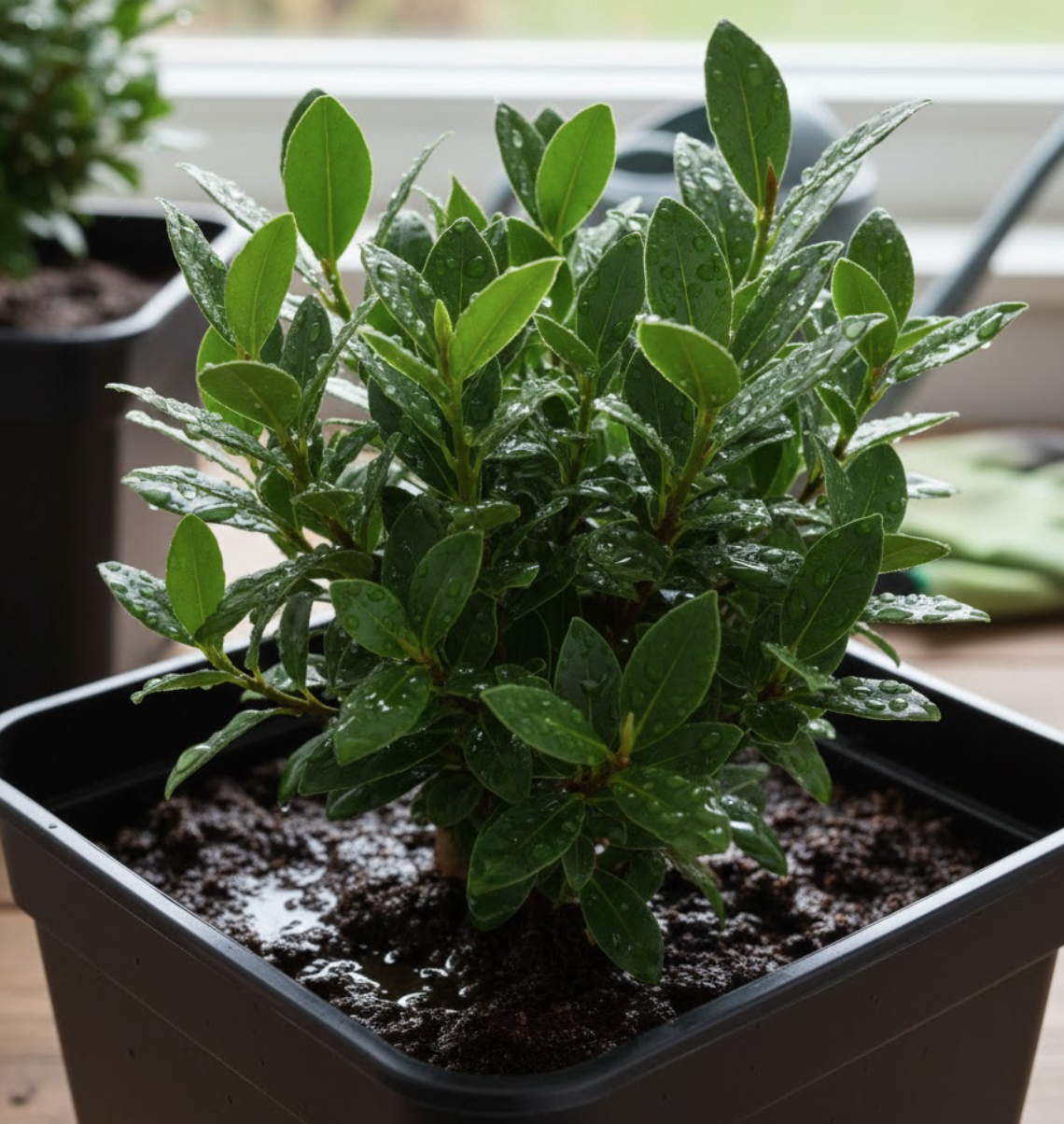 Чорний квадратний горщик з лавром — простий шлях до затишку та комфорту!